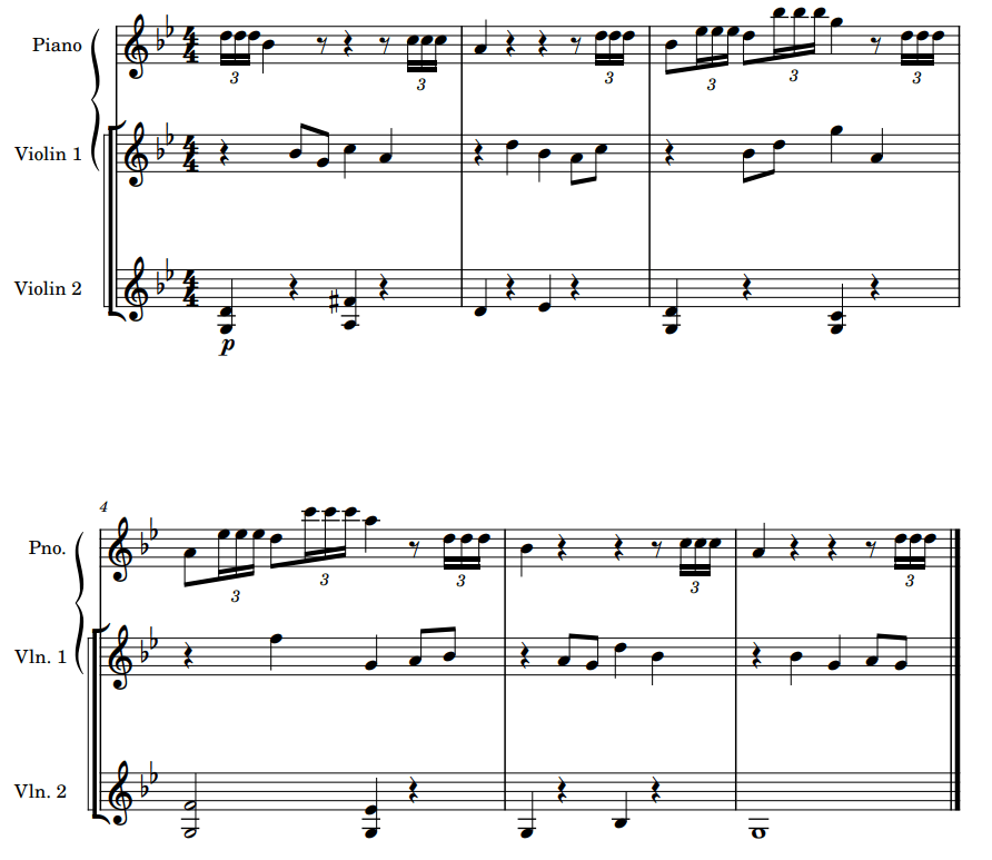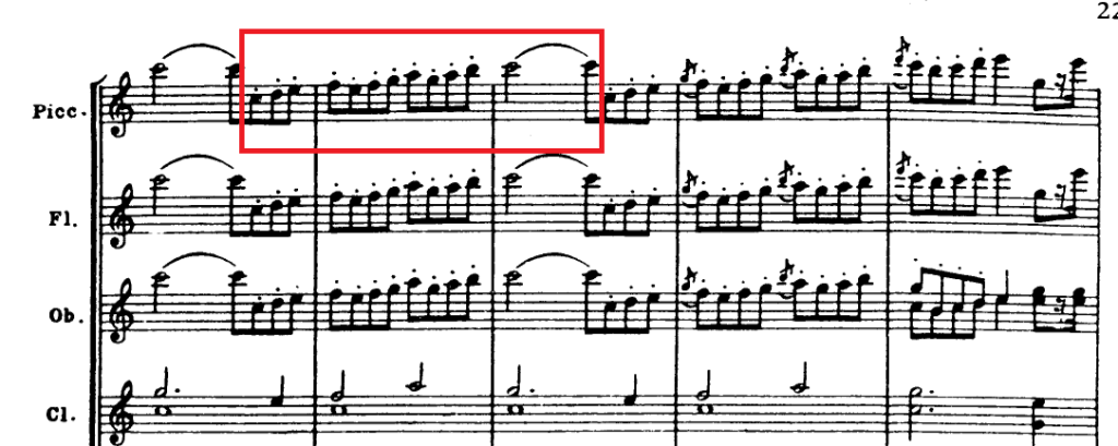 In the examples above, the flutes play a variation of Elgar’s main theme while the woodwinds play triplets in a “short-short-short-long” motif. I believe that this is a hint as to how the counterpoint works when it comes to discovering how Beethoven’s melody fits above Elgar’s main theme. This is why I decided to use triplets in my example, as it just makes sense from a rhythmic perspective.