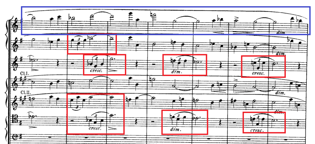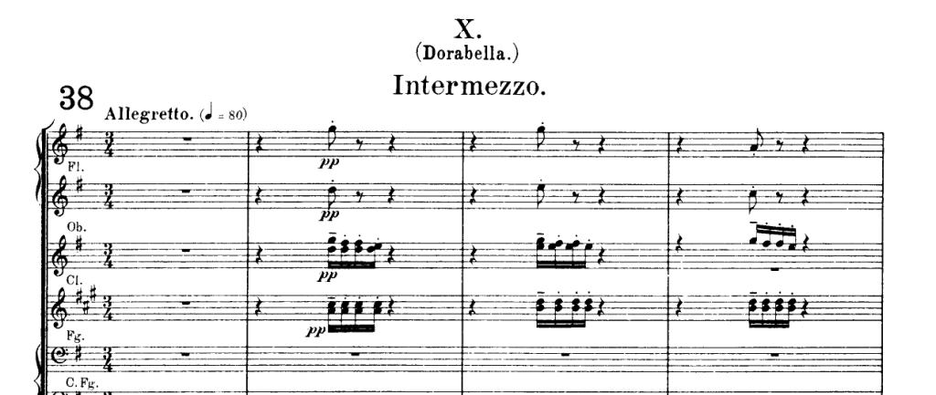 There is a four-note theme that plays throughout the Dorabella movement that hints at the hidden theme I am proposing. It could be called a backwards version of the famous “short-short-short-long” Beethoven theme. Elgar floats a “long-short-short-short” theme in the woodwinds throughout the movement as indicated not by rhythm, but accent markings: